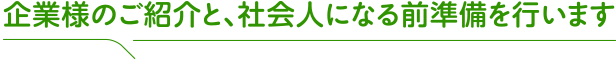企業様の変わりに、採用活動から教育の面までサポートさせていただくため、様々な研修の中で、社会人の土台作りを行います。社会人になる前から仕事に対する考え方、自分の強み・弱みを知ること、そして将来こうなりたいという目標を明確にしていくことで、入社後により皆様に成長を実感していただけます。